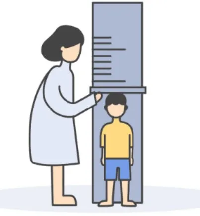 測量身高時,讓寶寶脫鞋靠墻站立,雙腳并攏,身體挺直,腳后跟、臀部、頭后部都貼近墻面,用水平的板面輕觸寶寶頭頂部并垂直于墻面,沿著板面畫線,然后測量和地面的垂直距離,即為身高。需要注意的是,身高的測量最好在每天同一時間進(jìn)行,比如早上起床后。因為重力的作用,早上的身高比晚上要高1cm左右。另外,身長和身高的測量值都應(yīng)精確到0. 1cm,并測量3次,取平均值,然后再標(biāo)繪在生長曲線圖上。