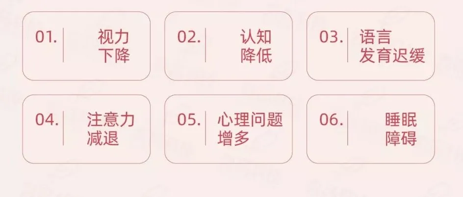 01、視力下降是直接危害小孩子的視力一般要到6歲才能逐漸發(fā)育成熟,并趨于正常。在這期間孩子的視覺系統(tǒng)還未發(fā)育完全,尤其是追蹤物體和深度視覺的能力遠(yuǎn)遠(yuǎn)不足,如果長時間使用電子屏幕就會對孩子視力發(fā)育造成傷害。