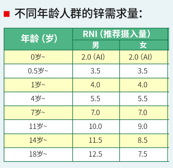 兒童青少年每日鋅推薦攝入量