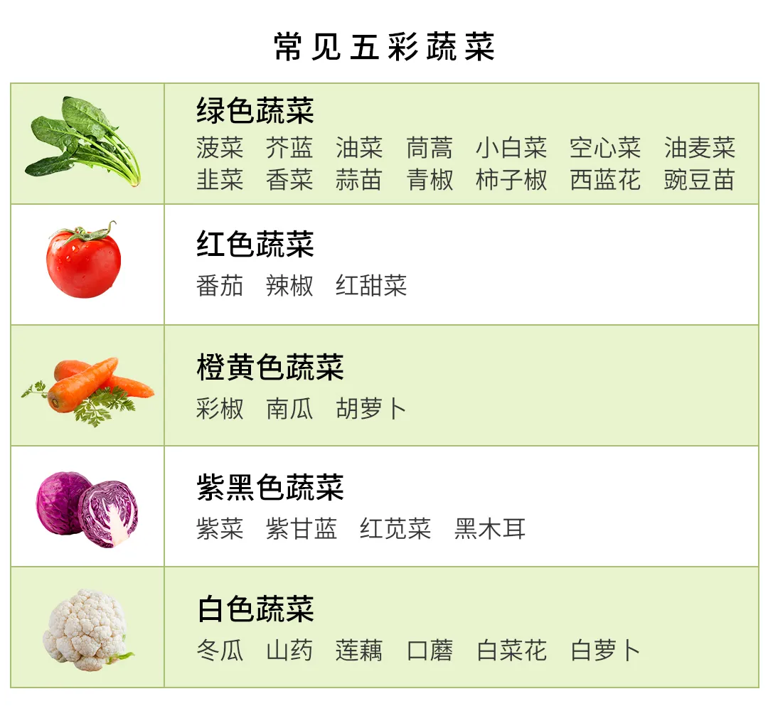 彩虹原則倡導(dǎo)在進(jìn)食足量蔬菜的同時,還要搭配5種顏色的蔬菜:綠色、紅色、橙黃色、紫黑色、白色。盡量做到一天中每一種顏色都能吃到,保證人體所需的微量營養(yǎng)素攝入合理充分。其中綠色、紅色、橙黃色、紫黑色是深色蔬菜,具有營養(yǎng)優(yōu)勢。